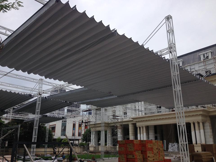- Hệ thống mái kéo sắt 20 x 40m, dày 1,2 ly, thanh sắt hộp chịu tấm mái (bạt) kéo.