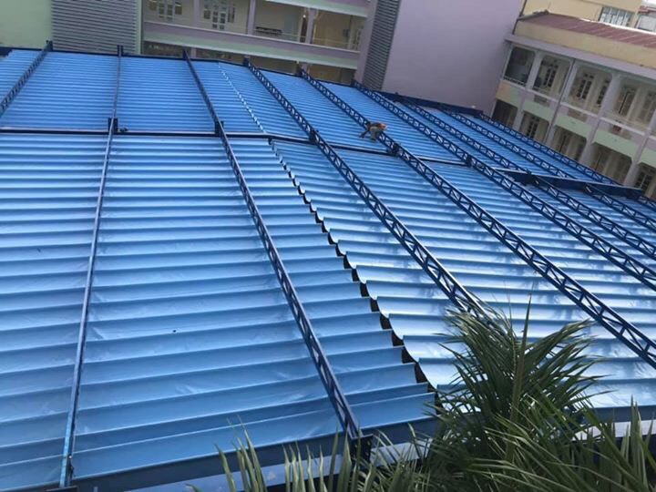 - Hệ thống mái kéo sắt 20 x 40m, dày 1,2 ly, thanh sắt hộp chịu tấm mái (bạt) kéo.