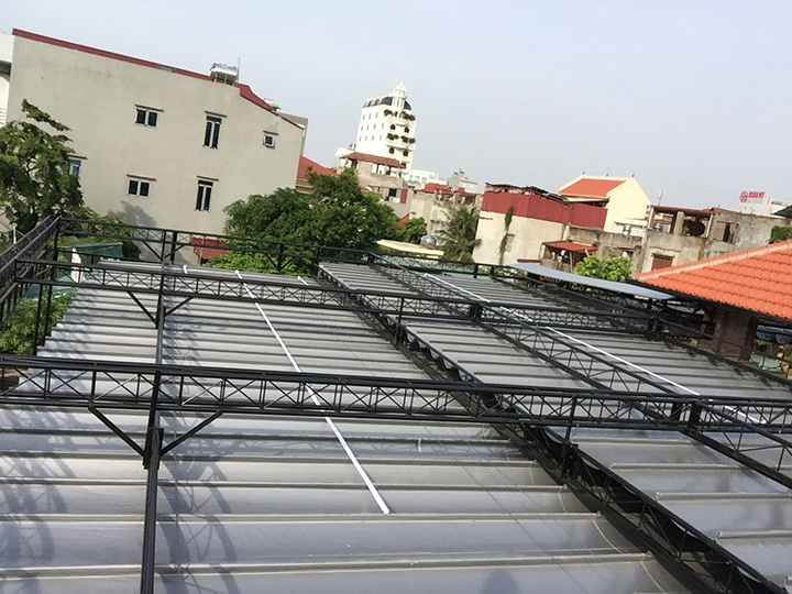 - Hệ thống mái kéo sắt 20 x 40m, dày 1,2 ly, thanh sắt hộp chịu tấm mái (bạt) kéo.
