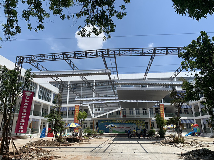 - Hệ thống mái kéo sắt 20 x 40m, dày 1,2 ly, thanh sắt hộp chịu tấm mái (bạt) kéo.
